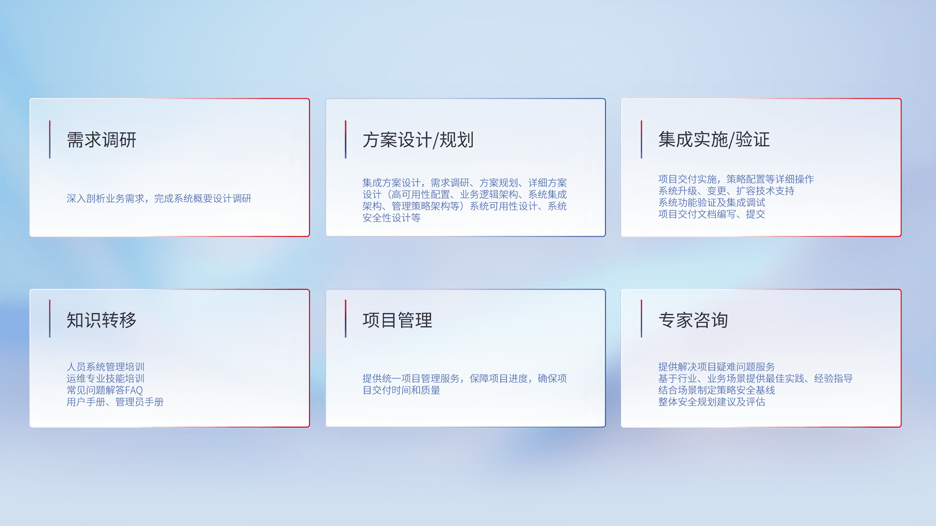针对客户行业特性,,,将宏观的安全战略和需求,,,通过专业的交付服务,,,,实现项目落地,,为客户提供标准规范的集成交付服务。。。。